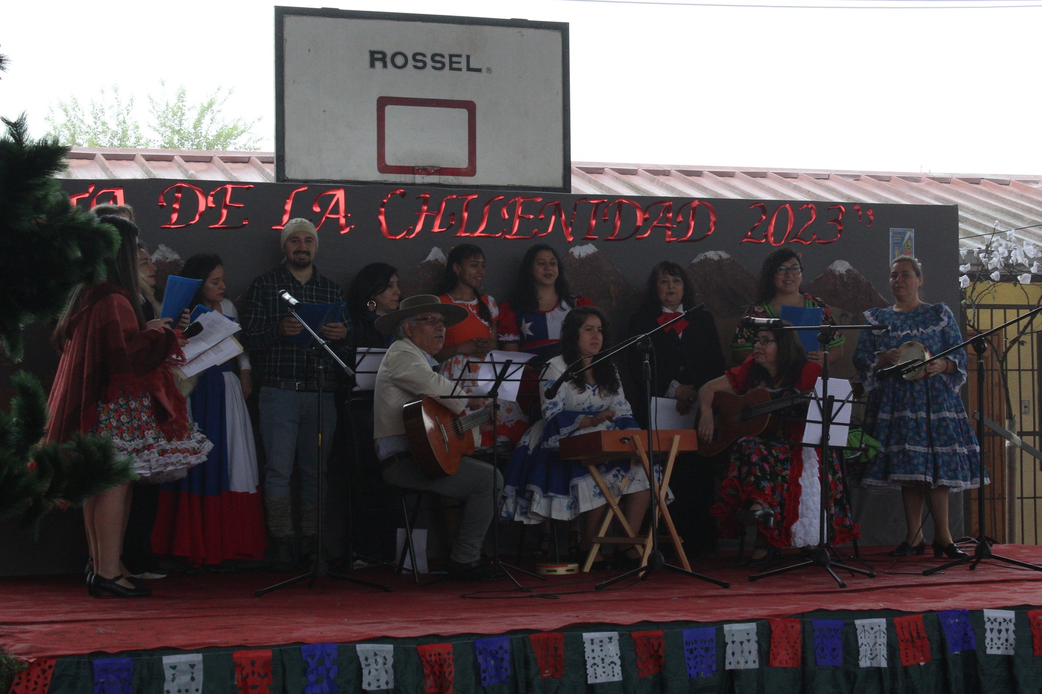Comenzamos la celebración con la entonación de nuestro himno nacional dirigido por la profesora Clara Espinoza e interpretado por todos los asistentes. La directora de la escuela, Sra Elsa Cáceres Toledo, entrega un saludo a los asistentes a la actividad, deseándoles unas felices Fiestas Patrias en familia. Los docentes de la escuela han preparado con mucho cariño un número dieciochero para esta celebración.